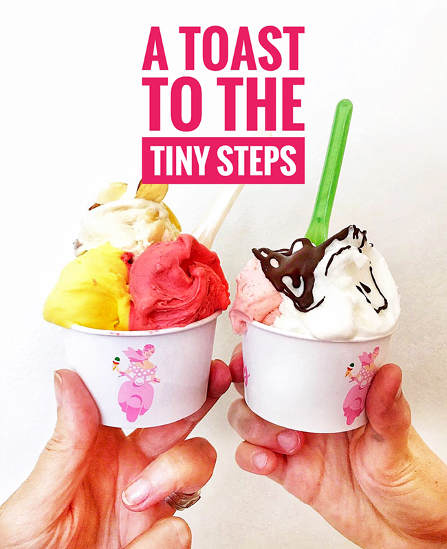 Write your own toast and list your 100 tiny steps. Raise your glass, or a taco (yes, you can toast with a taco), or ice cream and celebrate these tiny steps that have helped you change your life.