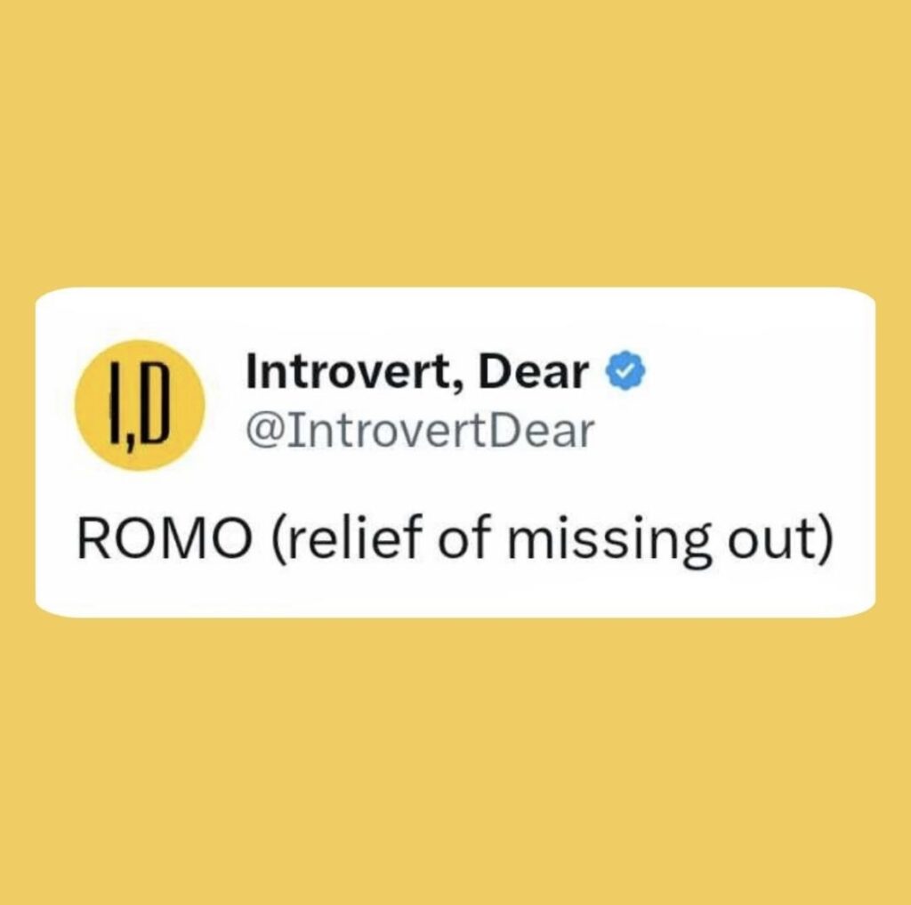 Today’s Instagram favorite is from @introvertdear because we’ve all had FOMO (fear of missing out) and JOMO (joy of missing out) and now we can fully embrace ROMO (relief of missing out).