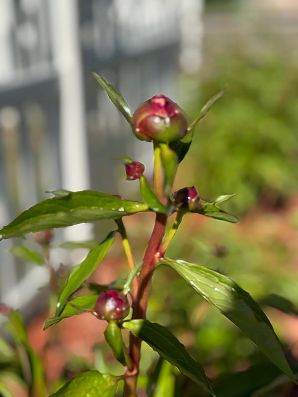 Last weekend, I told you about my 100 peonies that are ready to bloom and the next day, we had an unexpected snow storm with really heavy snow. When I got home, almost all of the peony plants were on the ground weighed down with the wet snow. My husband and I gently shook the snow off and covered each plant with a large garbage bag and hoped for the best. It continued to snow and we went out every hour or so and moved the snow off of the bags. The next afternoon, even though it was still cold, we removed the bags and tied the plants to our neighbors fence (with their permission) so they could stay upright with ease. With sunny skies and warmer temps I’m hopeful that the plight of the peonies is over.