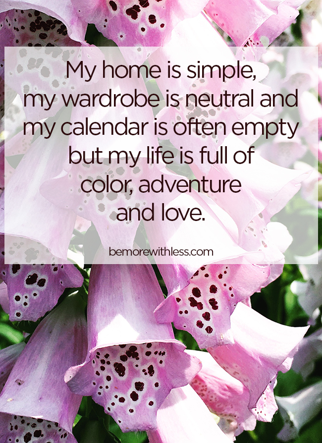 If you worry that simplicity will be boring or empty, consider that what’s on the other side of your stuff is the life, work, and love you’ve been dreaming about. My home is simple, my wardrobe is neutral and my calendar is often empty but my life is full of color, adventure and love.