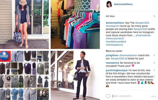 Instagram: I’m sharing Project 333 Round-Up Posts once or twice a week linking to inspiring people like you who are sharing their capsule wardrobe pics and daily outfits with the hashtag #project333. Here is a recent example …