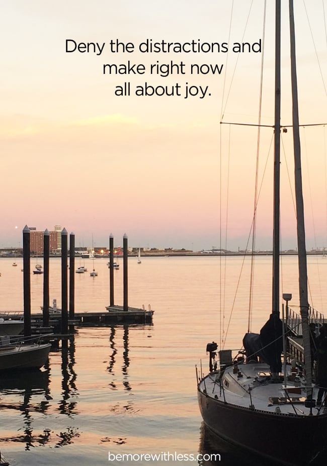If something joyful is tugging at your arm, or your heart, give in. Let the email wait. Leave the dishes in the sink and check your voice mail tomorrow. Deny the distractions and make right now all about joy.