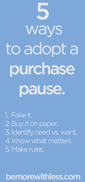 5. Make rules. Challenge yourself to stick with a few shopping rules so you can fully embrace the power of a purchase pause. Before purchasing, wait 30 days for anything less than $100 and 60 days for everything that costs more than $100.
