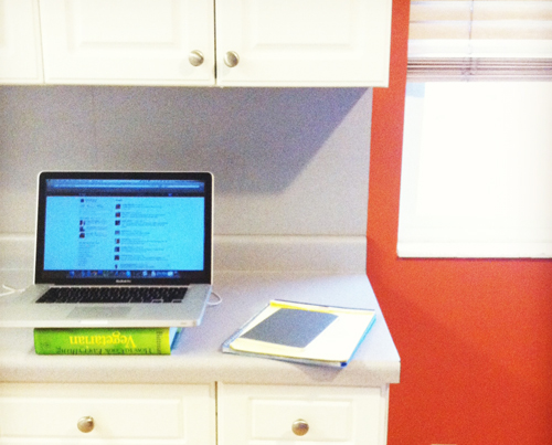 Create a make-shift stand up desk so you have an alternative to sitting all day. You don’t need anything fancy. My standing desk is pictured above.