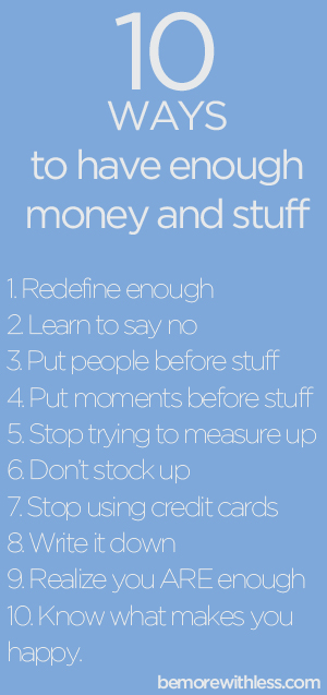 - Redefine enough. Your current definition of enough may be more than you think. Do the simple counting exercise below and see what is really enough for you and your family.